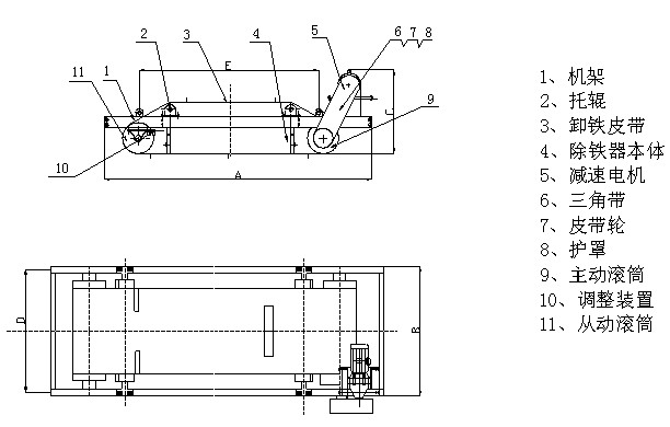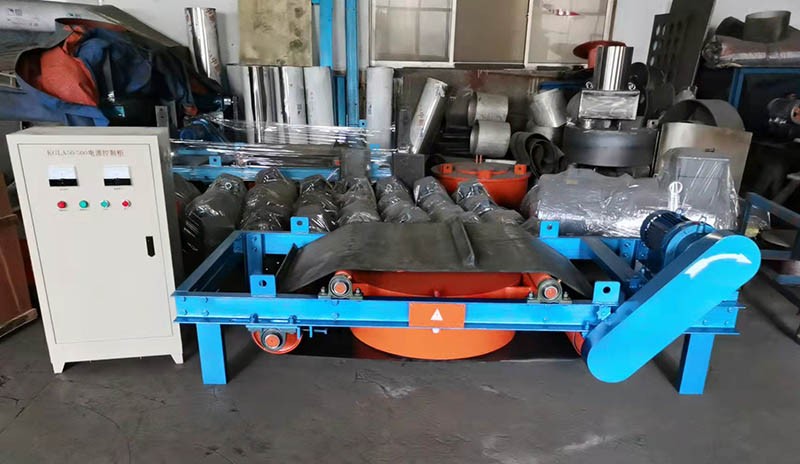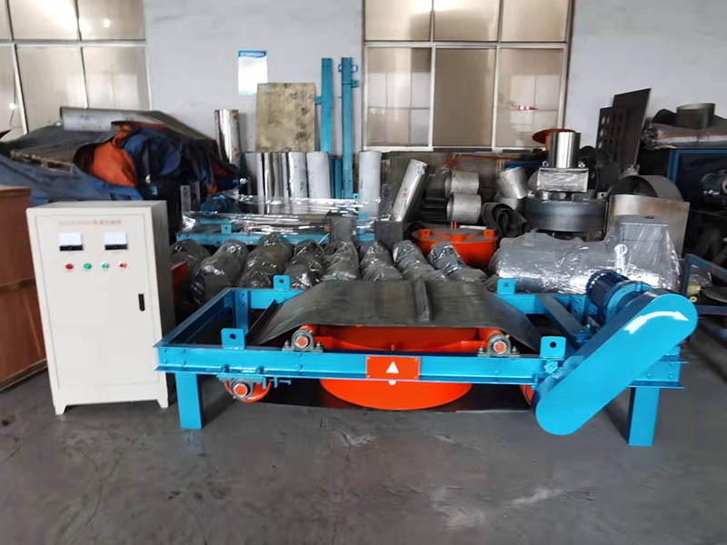 除鐵器自卸皮帶的運行方向與輸送皮帶運行方向垂直的方向自動清除鐵磁雜物??砂惭b在輸送皮帶上方(在除鐵器下方宜安裝非導磁直托輥)。