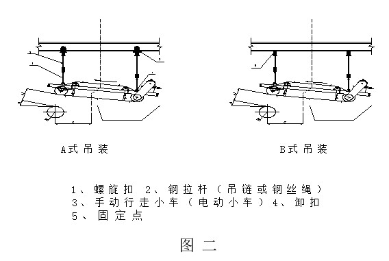 SP-A式吊裝 四條鏈索掛在雙軌或單軌行走小車上SP-B式吊裝 四條拉桿分別吊在四個固定吊點上