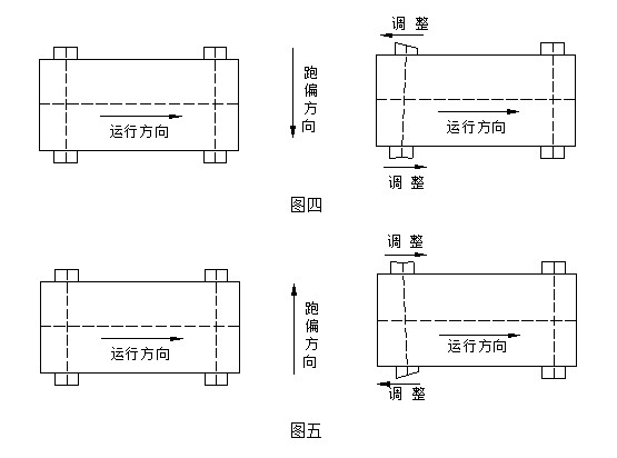 卸鐵皮帶向前進方向右側(cè)跑偏(見圖四)調(diào)整方法:將兩側(cè)的軸承調(diào)節(jié)裝置均等地調(diào)節(jié),使從動滾筒與皮帶前進方向成直角,然后在皮帶跑偏側(cè)使?jié)L筒端向前進方向移動距離,或者使皮帶跑偏側(cè)對面滾筒后退一段距離。