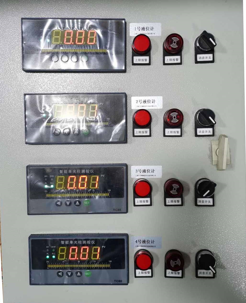 控制柜內(nèi)部嵌入有多個(gè)液位變聲器控制主機(jī),該主機(jī)能實(shí)時(shí)采集液位變送器的數(shù)據(jù),并更加設(shè)定的報(bào)警閾值給出 上下限閾值聲光報(bào)警的功能