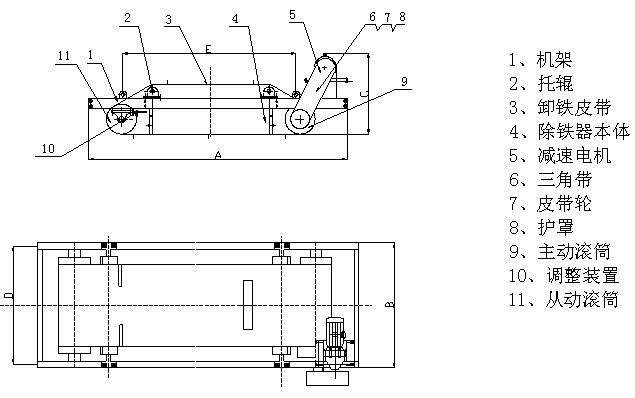 工作原理:當(dāng)輸送機(jī)上的散狀物料經(jīng)過除鐵器下方時(shí),混雜在物料中的鐵磁性雜物,在磁場(chǎng)力作用下被吸起,由運(yùn)行地卸鐵皮帶連續(xù)拋出,當(dāng)物料脫離磁場(chǎng)范圍外,鐵磁性雜物在重力作用下掉入集鐵箱中。