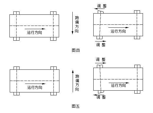 卸鐵皮帶向前進(jìn)方向右側(cè)跑偏(見圖四)調(diào)整方法:將兩側(cè)的軸承調(diào)節(jié)裝置均等地調(diào)節(jié),使從動(dòng)滾筒與皮帶前進(jìn)方向成直角,然后在皮帶跑偏側(cè)使?jié)L筒端向前進(jìn)方向移動(dòng)距離,或者使皮帶跑偏側(cè)對(duì)面滾筒后退一段距離。